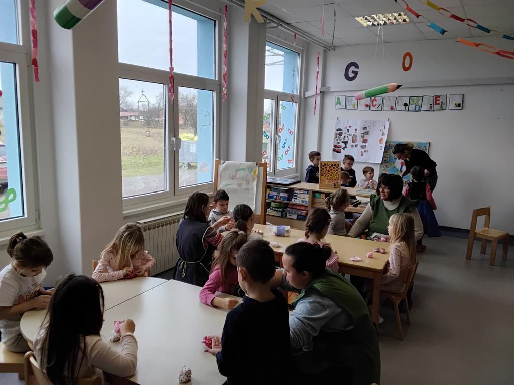 S djecom je izradila poklone za majke povodom Valentinova. Izrađivali smo platnena srca i cvijet tulipan koje su djeca punila vatom te zatim vrijednim ručicama to samostavlno i šivala.