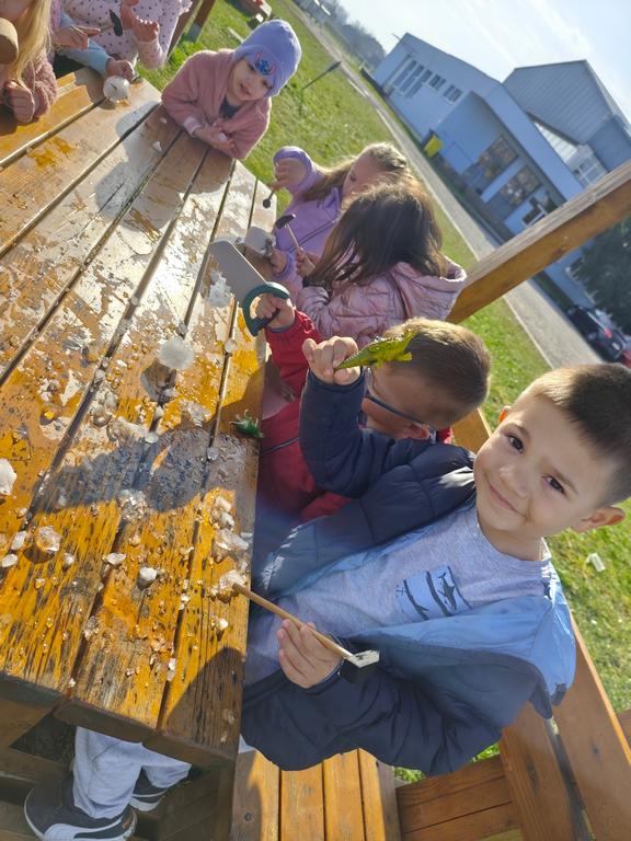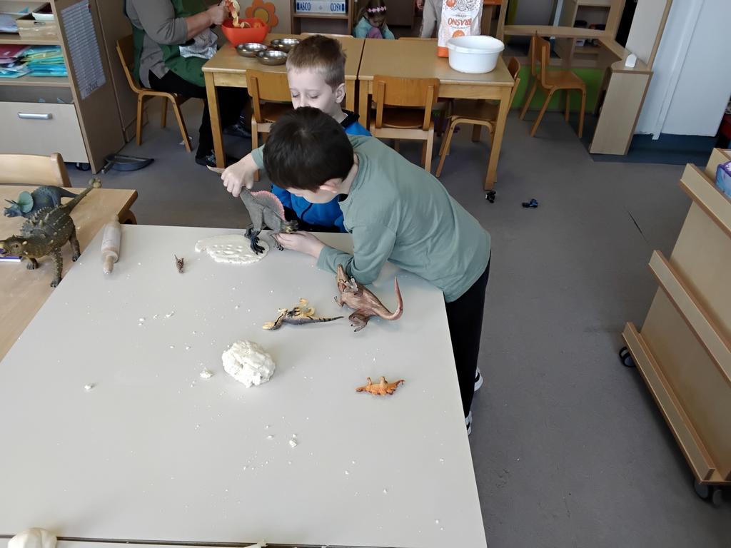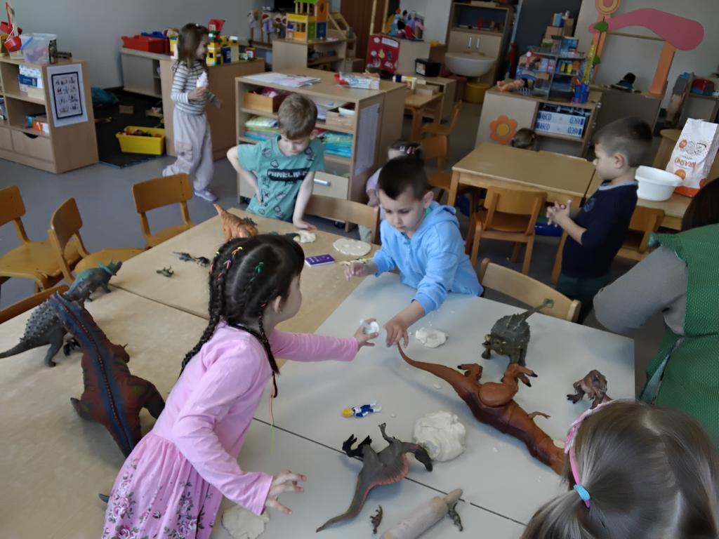 Kroz različite istraživačke i kreativne aktivnosti zajedno smo otkrili svijet dinosaura. Promatrali smo i istraživali fosile koje smo izradili u slanom tijestu pomoću igračaka dinosaura, razgovarali o tome kako fosili nastaju te kakve nam priče pričaju o prošlosti. Djeca su također izrađivala dinosaure i kostur dinosaura od papirnatih tanjura, razvijajući pritom svoju kreativnost, maštu i finu motoriku.