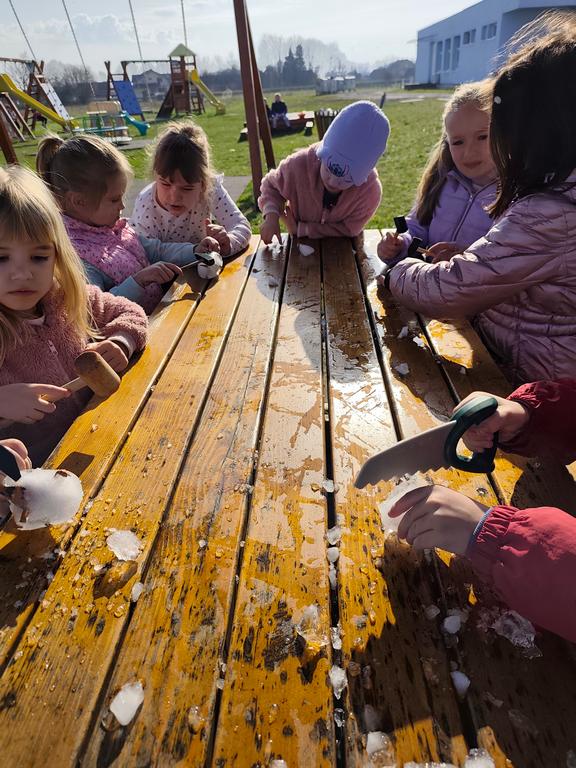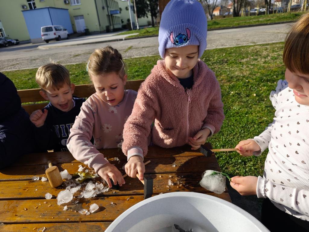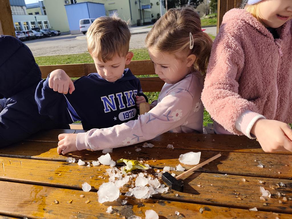 Veliko oduševljenje izazvala je i istraživačka aktivnost u kojoj su djeca razbijala led u kojem su bili zaleđeni mali dinosauri. Djeca su istraživala na koji način mogu "osloboditi" dinosaure, koristeći različite metode i pritom razvijajući strpljenje, suradnju i logičko razmišljanje.