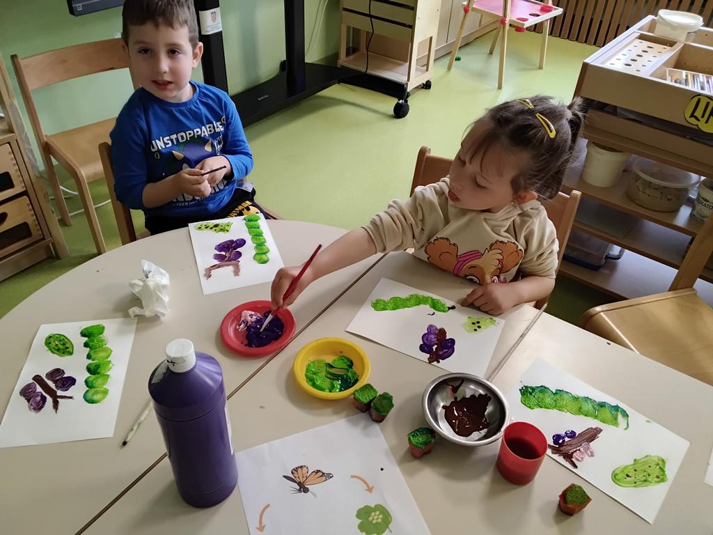 Poseban doživljaj bio je kada je u terariju leptir položio jajašca, što smo zajedno istraživali pomoću povećala. Inspirirani pričom „Vrlo gladna gusjenica”, djeca su zajednički izradila pano – svako dijete oslikalo je jedan dio tijela gusjenice.