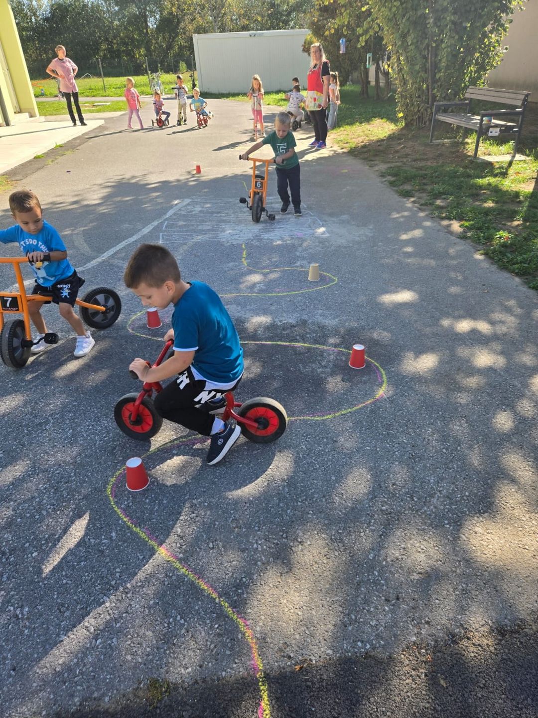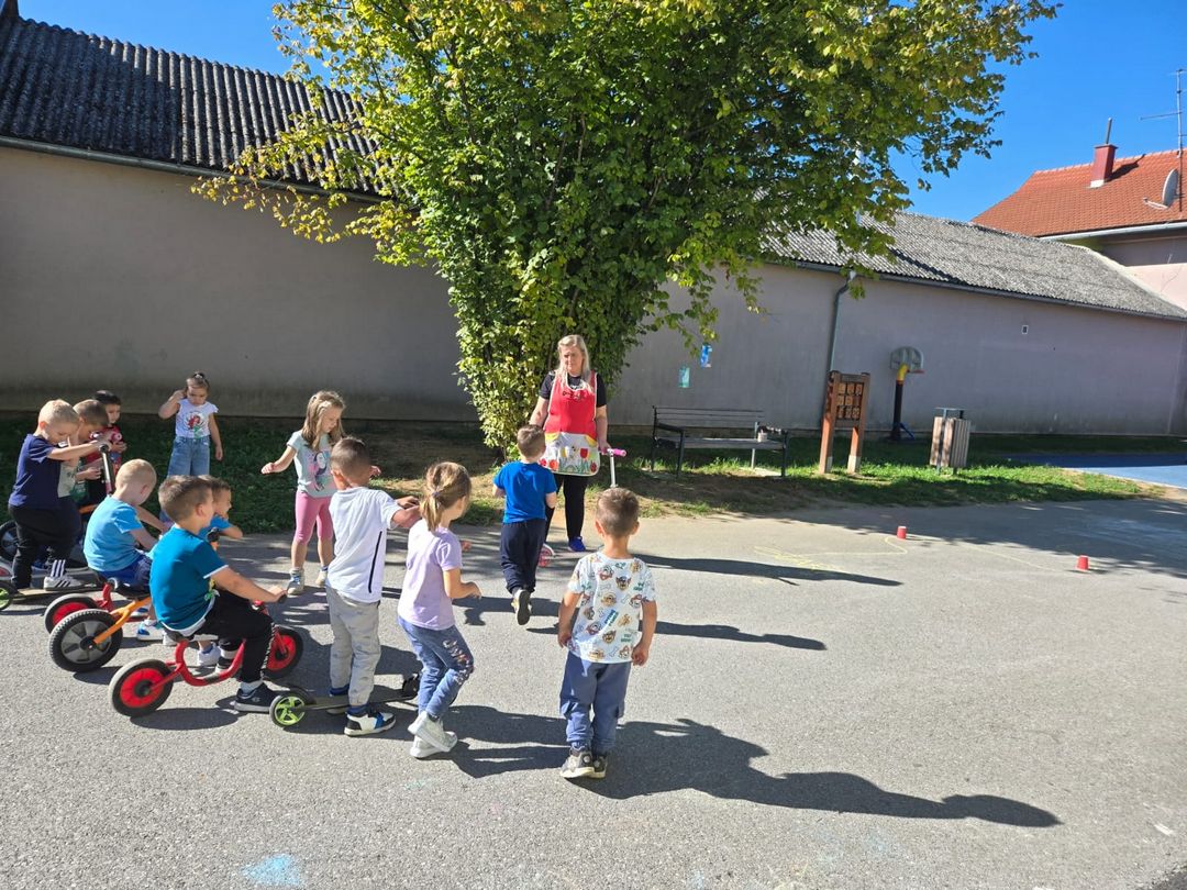 Promatrali smo iz vrtićkog dvorišta kakav je promet u mjestu na ovaj dan i uočili razliku između automobila, biciklista i pješaka. Na dvorištu smo organizirali poligon za bicikle i pješake, a dodali smo i igru Semafor kako bi djeca učila osnovna pravila ponašanja u prometu.