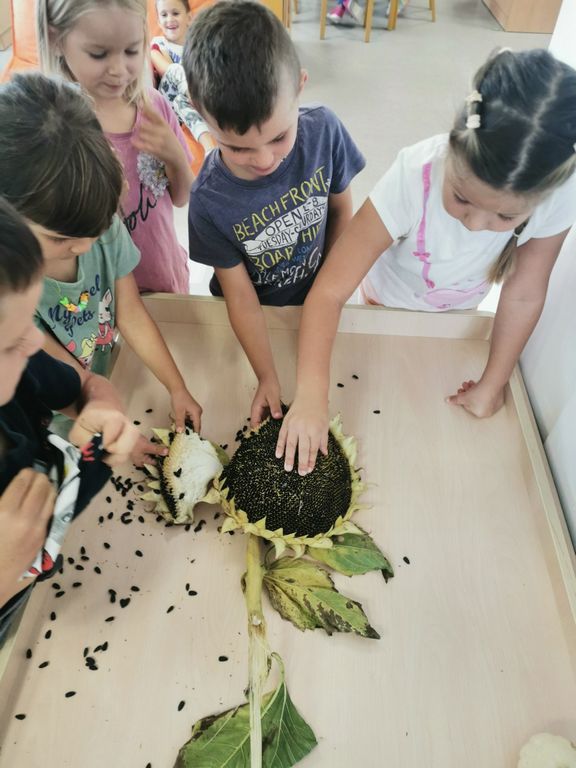 U našem vrtiću veselo smo i zajednički dočekali prvi dan jeseni! Skupine Kockice, Pčelice, Točkice i Mravići kroz igru i kreativne zadatke otkrivale su ljepote ovog godišnjeg doba. Djeca su slikala bundeve, istraživala dijelove suncokreta, izrađivala kolaž u obliku lista te oslikavala listove temperama u raznim bojama.
