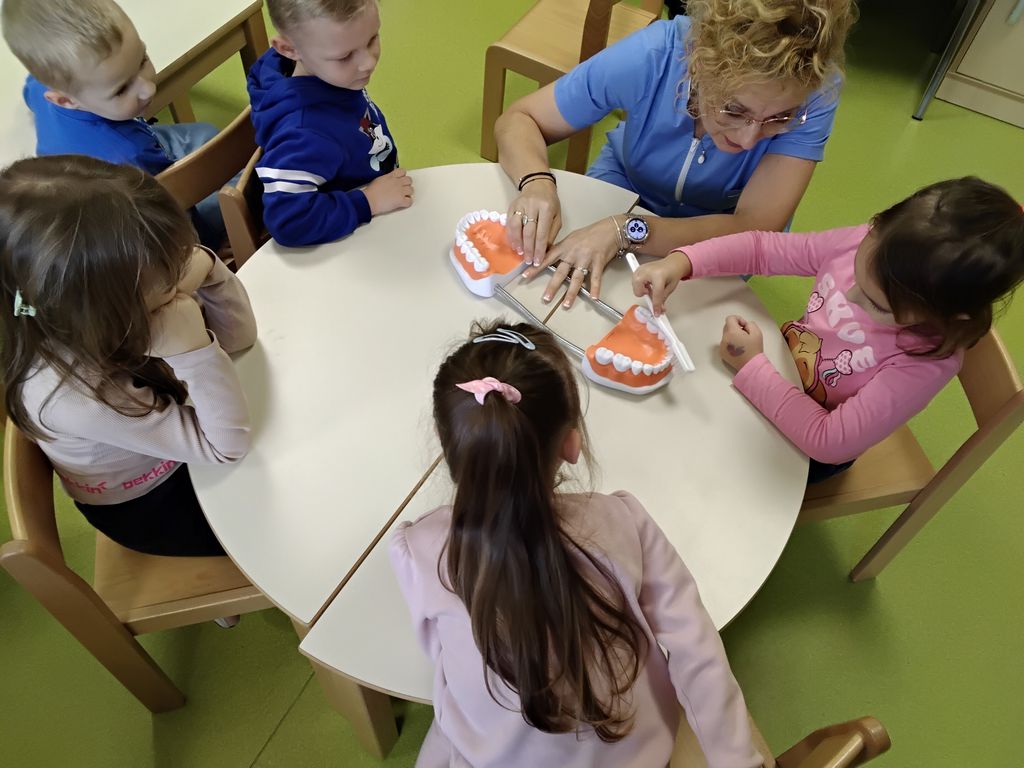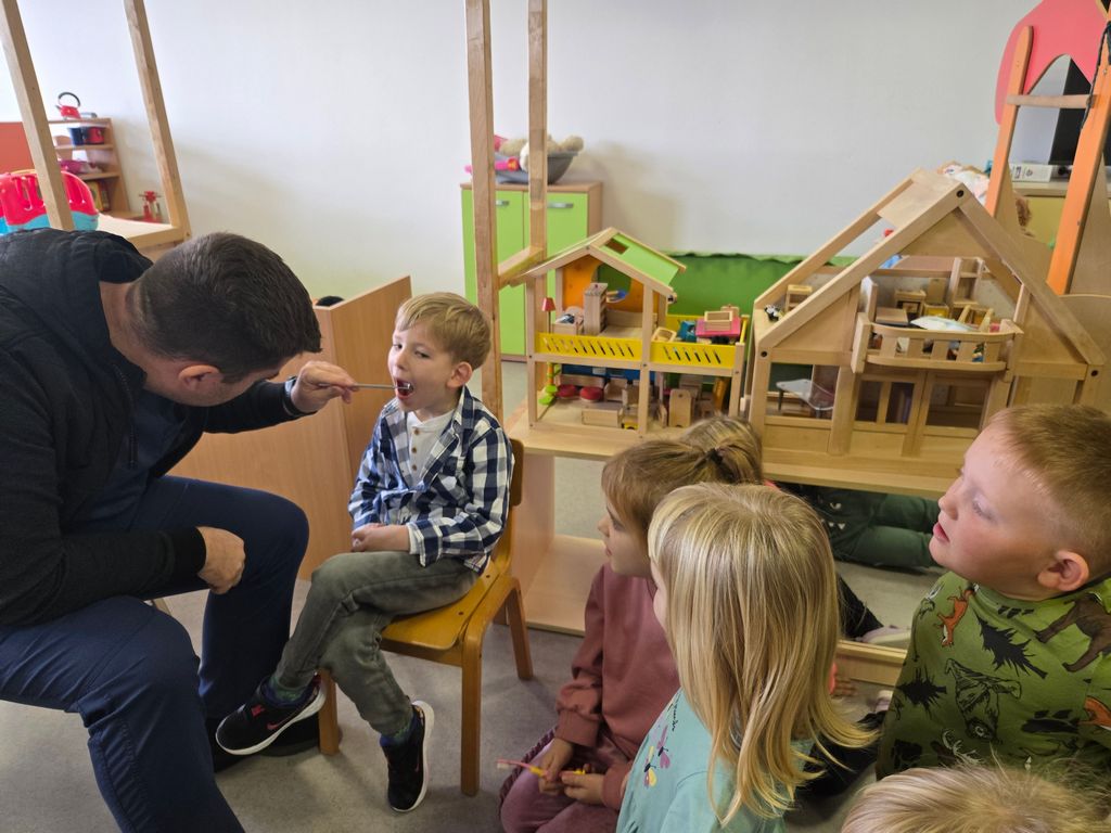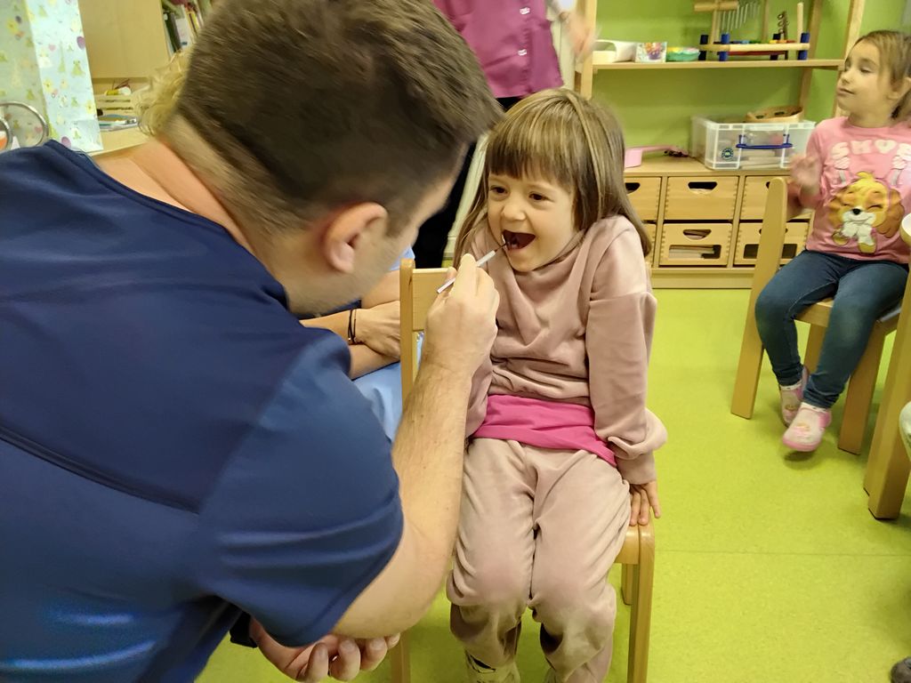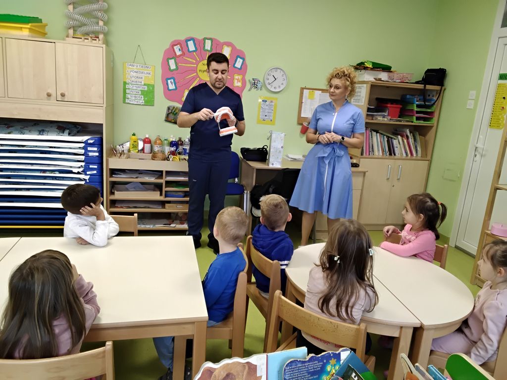 S ciljem podizanja svijesti o važnosti brige za zdravlje zubi od najranije dobi, naš je vrtić posjetio stomatolog dr. med. dent. Pjer Menković sa dentalnom asistenticom Ivanom Dorosulić. Cilj posjeta bio je potaknuti djecu na usvajanje pozitivnih stavova i navika vezanih uz oralno zdravlje te smanjiti eventualni strah od odlaska stomatologu, uz istodobno približavanje ovog zanimanja djeci.