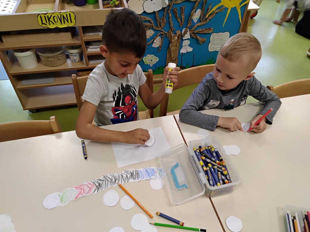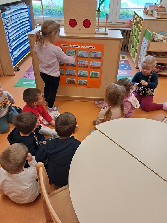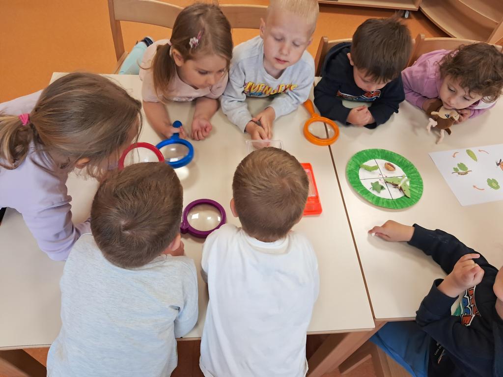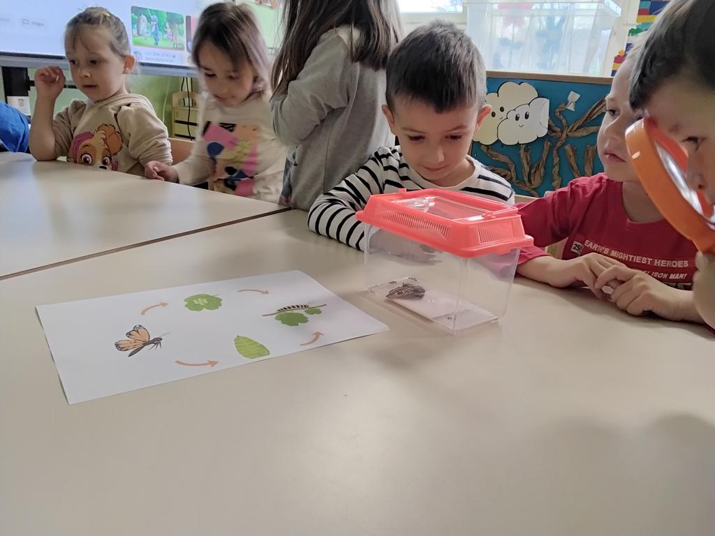 Poseban doživljaj bio je kada je u terariju leptir položio jajašca, što smo zajedno istraživali pomoću povećala. Inspirirani pričom „Vrlo gladna gusjenica”, djeca su zajednički izradila pano – svako dijete oslikalo je jedan dio tijela gusjenice.