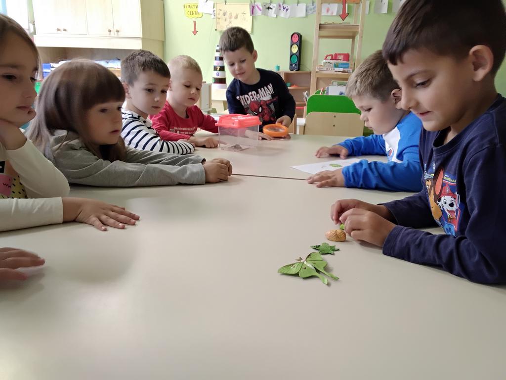 U skupini „Pčelice”, kroz igru i istraživanje upoznavali smo razvoj leptira pomoću didaktičkog materijala koji prikazuje sve faze – od jajašca, gusjenice, kukuljice pa do leptira.