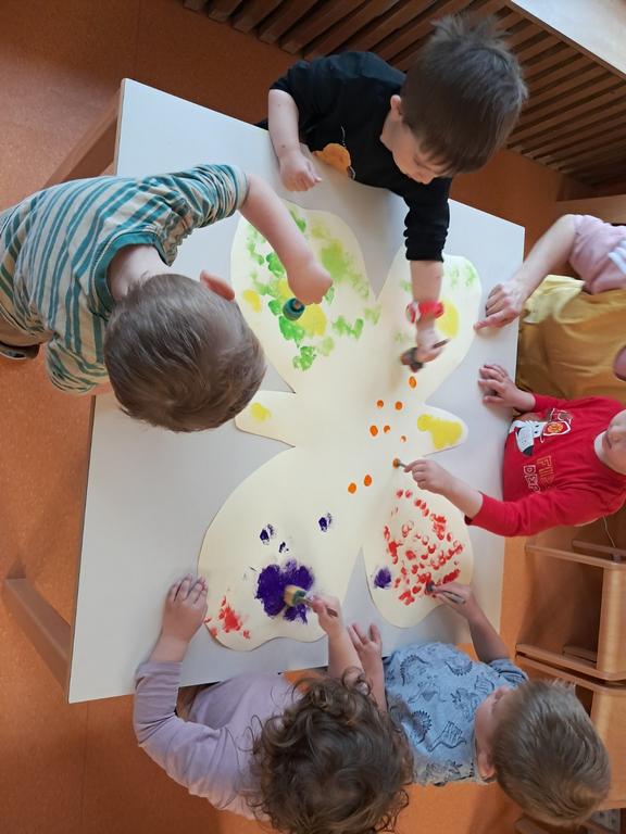 Djeca su s velikim interesom promatrala promjene i kroz likovne aktivnosti oslikavala velikog leptira temperama.